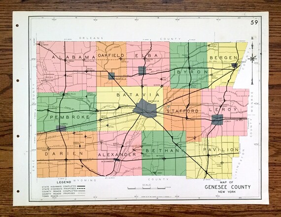 Antique Genesee County, New York 1941 Historical Atlas Map Batavia